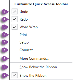 The Quick Access Toolbar, by default, is available from the top left corner of the Flex Terminal Emulator window and provides the ability to enable commonly used functions. Pressing the Customize Quick Access Toolbar button, next to the Flex Terminal Emulator logo, will display the following dialog for customizing the toolbar: